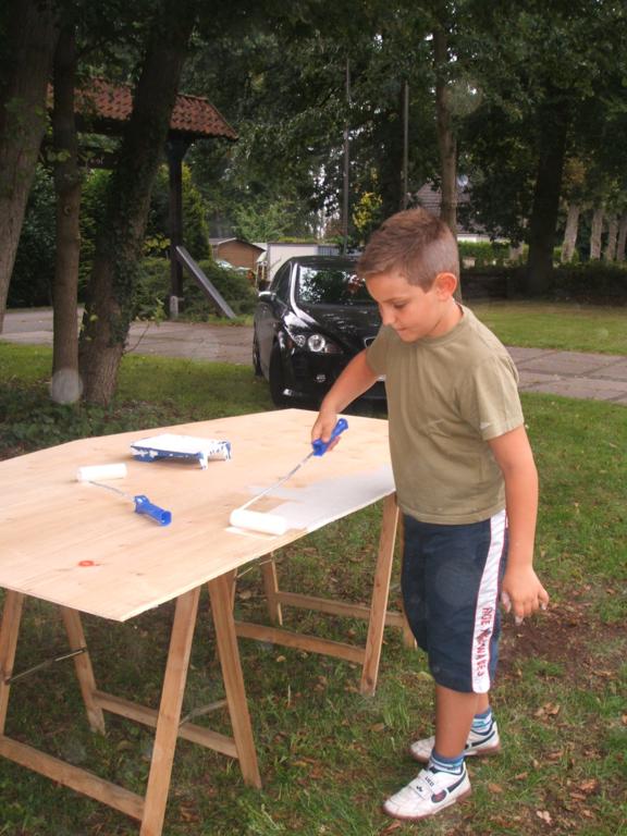 ... und gestrichen. An diesem Nachmittag wurden insgesamt 12 Platten zugeschnitten, grundiert und zum Trocknen in der Schützenhalle ausgelegt. Da die Beteiligung und die Arbeit gut von der Hand ging...